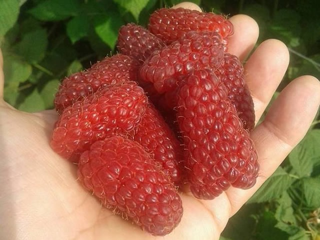 Ягоды: цилиндрической и тупоконической формы, крупные. Средняя масса плодов — 9,7 граммов, длина — 3–5 см. В каждом урожае встречаются и более крупные экземпляры — 12–14 г. Кожица спелой малины интенсивно красного окраса, крепкая, эластичная. Мякоть — мясистая, ароматная. Вкус — нежный, десертный.