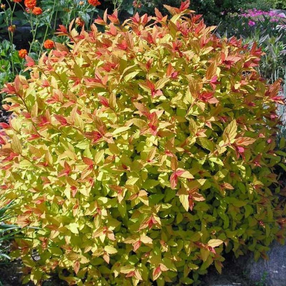 Листва: мелкие, овальные, весной и летом — ярко-жёлтые с оранжевым оттенком, осенью — оранжево-красные.