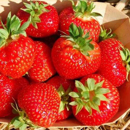 Ягоды: глянцевые, с множественными слабовдавленными жёлтыми семечками, ярко-алого цвета, округлые, ширококонические, без шейки. Мякоть сочная, плотная, без пустот, с насыщенным сладким вкусом и нежным клубничным запахом.